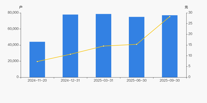 2024年11月20日至今,公司股东户数显著大幅增长,区间涨幅达74.80%。2024年11月20日至2025年9月30日区间股价上涨286.13%。