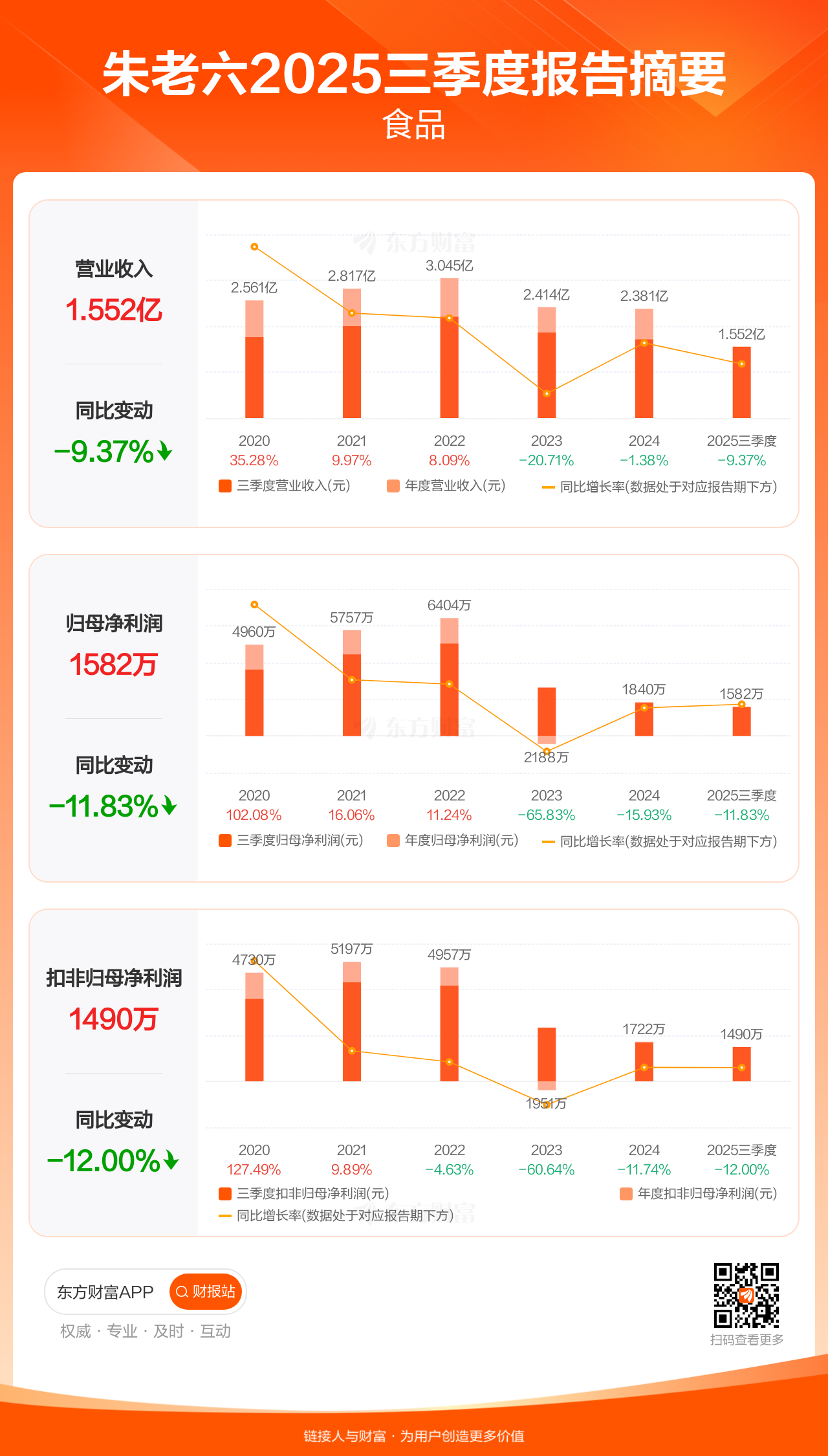 图解财报:朱老六前三季归母净利润1582.02万元,同比减少11.83%