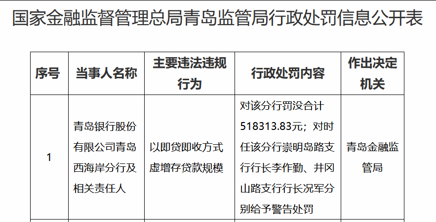 10月23日,国家金融监督管理总局青岛监管局行政处罚信息公开表显示,青岛银行股份有限公司青岛西海岸分行及相关责任人因以即贷即收方式虚增存贷款规模被处罚,青岛金融监管局对该分行罚没合计518313.83元;对时任该分行崇明岛路支行行长李作勤、井冈山路支行行长况军分别给予警告处罚。
