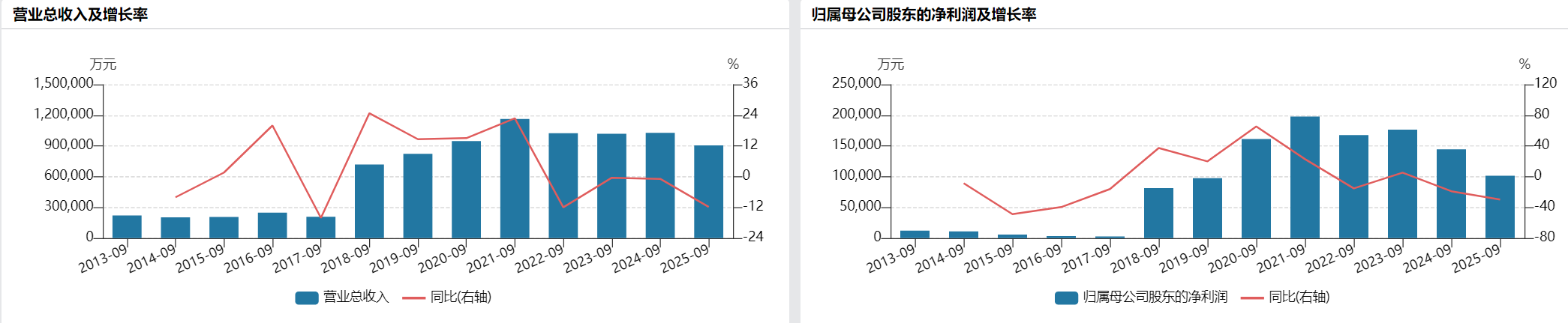 10月24日,芒果超媒股份有限公司(芒果超媒,300413.SZ)披露2025年第三季度报告,公司前三季度营业收入为90.63亿元,同比下降11.82%;归母净利润为10.16亿元,同比下降29.67%;扣非归母净利润为7.91亿元,同比下降35.50%。