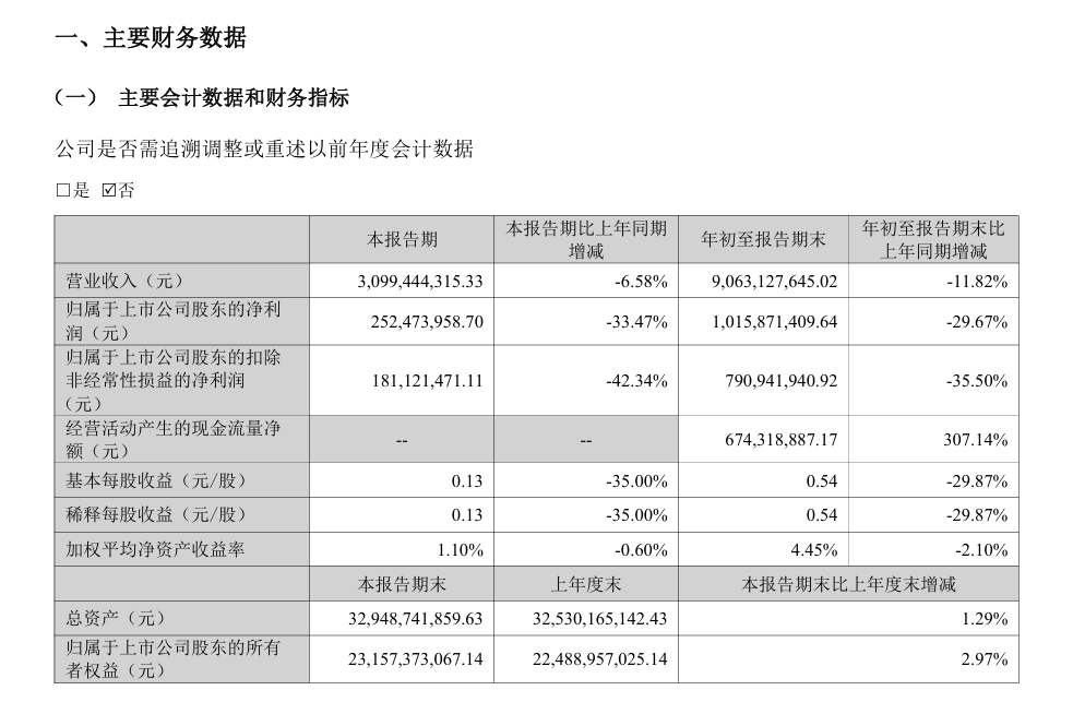 其中,第三季度营业收入为30.99亿元,同比下降6.58%;归母净利润为2.52亿元,同比下降33.47%;扣非归母净利润为1.81亿元,同比下降42.34%。