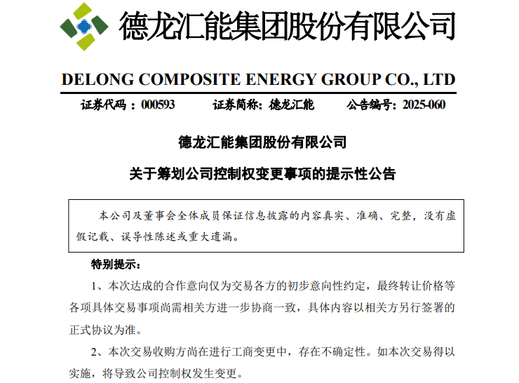 德龙汇能(000593)10月24日晚间披露,公司控股股东顶信瑞通与东阳诺信芯材企业管理合伙企业(有限合伙)(下称“诺信芯材”)签订了《股份转让之意向协议》,拟将其持有公司29.64%股份转让给诺信芯材,(交易)可能导致公司控制权发生变更。目前,各方主体正在就具体交易方案、协议等相关事项进行磋商,尚存在重大不确定性。