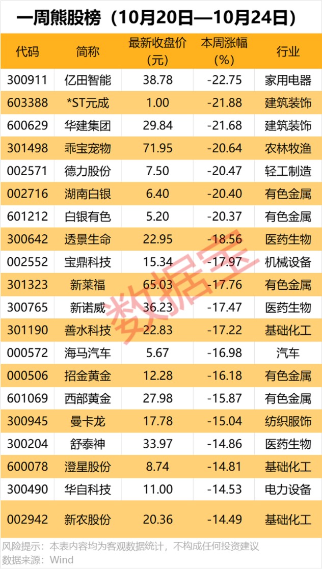 本周累计下跌的个股中,48股跌幅在10%以上,亿田智能、*ST元成、华建集团、乖宝宠物、德力股份、湖南白银等累计跌幅均在20%以上。