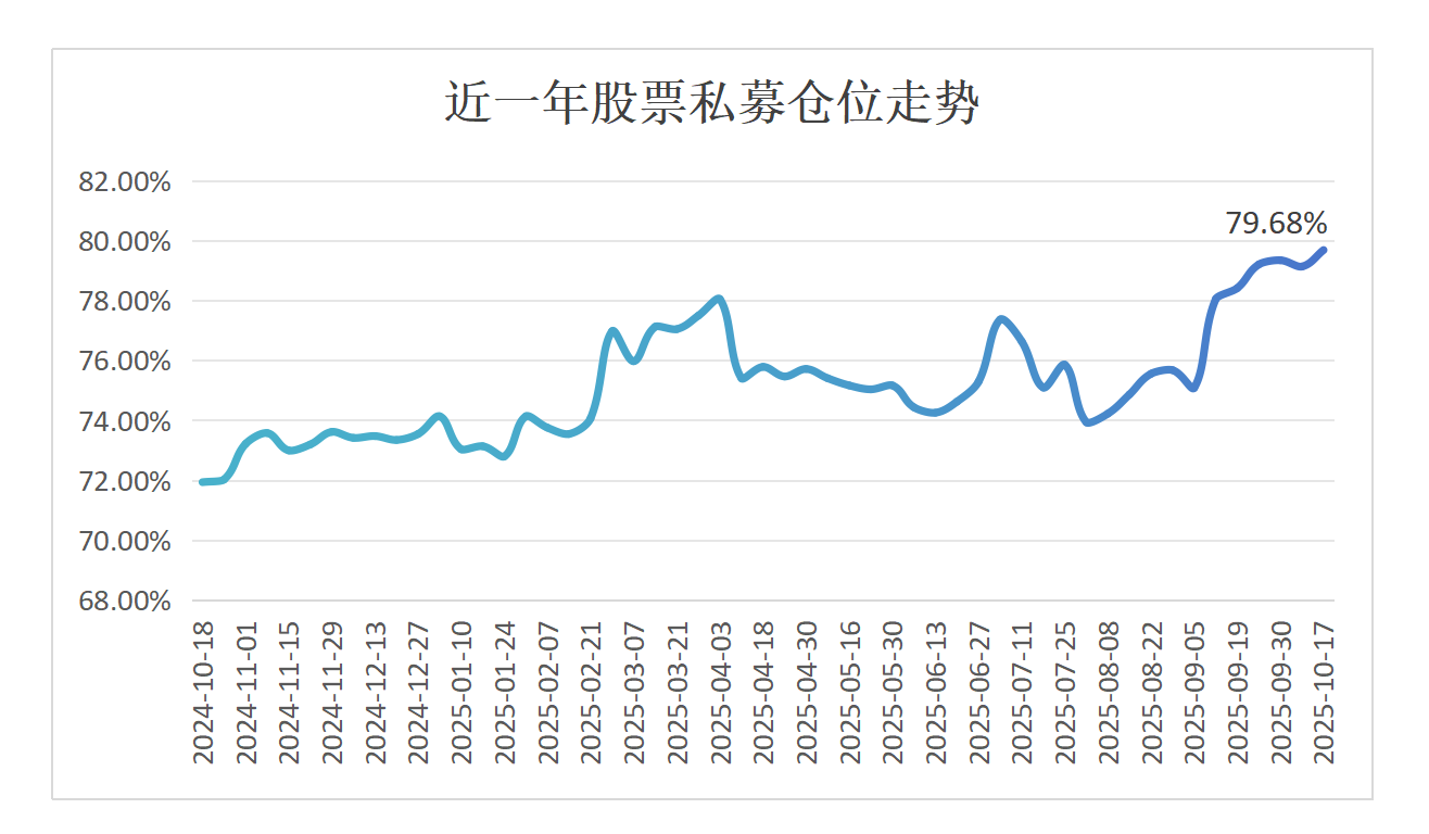 数据显示,截至10月17日,股票私募仓位指数升至79.68%,较前一周上涨0.55%,创近一年新高。从趋势看,自今年8月以来,该指数累计上涨5.75%,加仓趋势显著。