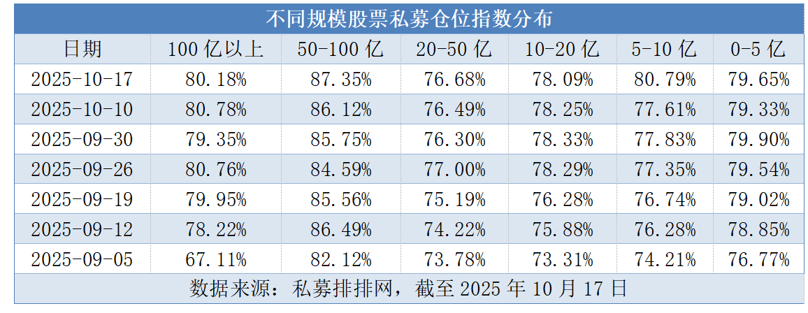 头部私募仓位更加激进。数据显示,截至10月17日,100亿元以上、50亿至100亿元、20亿至50亿元、10亿至20亿元、5亿至10亿元和0至5亿元规模股票私募的仓位指数依次为80.18%、87.35%、76.68%、78.09%、80.79%和79.65%。其中,50亿至100亿元规模私募以87.35%的仓位居首,创近三年新高;100亿元以上规模私募仓位达80.18%,且连续2周维持在80%以上。头部私募资金规模庞大,持续高仓位运作,既彰显其对市场的长期信心,也得益于客户稳定、赎回压力小,具备长期持有的底气。