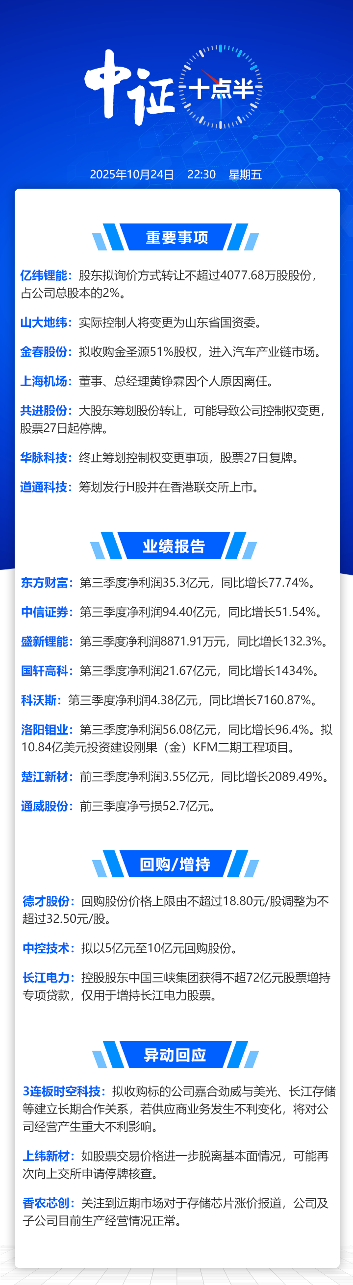 【中证十点半】科沃斯三季度净利润增长超71倍;中控技术拟大手笔回购;上纬新材回应股价异动