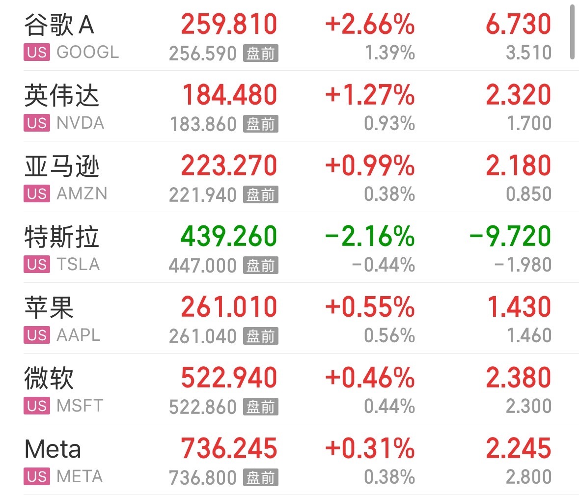 大型科技股多数上涨,谷歌涨超2%,英伟达涨超1%,亚马逊、苹果、微软、Meta微涨,特斯拉跌超2%。