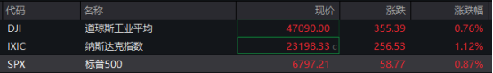 数据发布后,美元指数短线跳水,黄金则直线拉升。美股三大指数集体高开高走,盘中均创历史新高,截至发稿,道指涨0.76%,纳指涨1.12%,标普500指数涨0.87%。