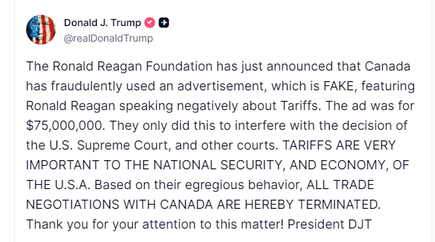 特朗普在帖文中附上了罗纳德·里根基金会发布的声明,声明称,加拿大安大略省政府发布了一则广告,其中使用了前总统里根1987年4月25日发表的“关于自由公平贸易的全国广播讲话”的部分音频和视频片段。该广告曲解了前总统里根的广播讲话内容,且安大略省政府在使用和编辑这些讲话内容时既未寻求也未获得许可。