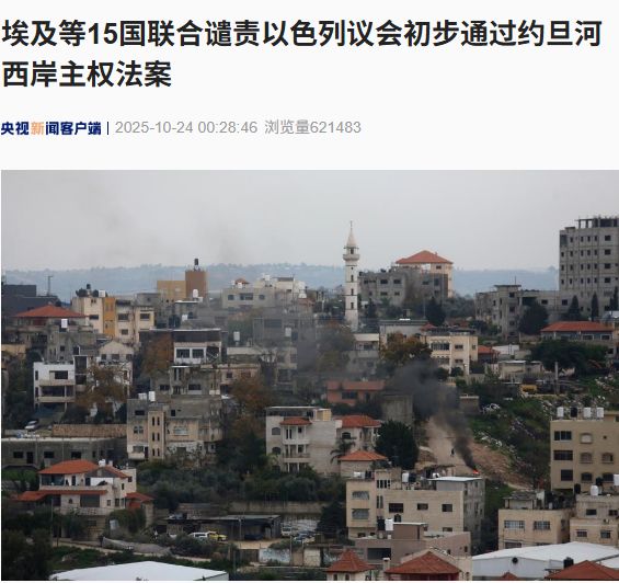 据央视新闻10月24日消息,当地时间10月23日,埃及、约旦、卡塔尔、沙特、巴基斯坦、印尼等15国和阿拉伯国家联盟、伊斯兰合作组织发表联合声明,强烈谴责以色列议会批准的两项旨在将以色列主权扩展至约旦河西岸和非法定居点的法律草案。