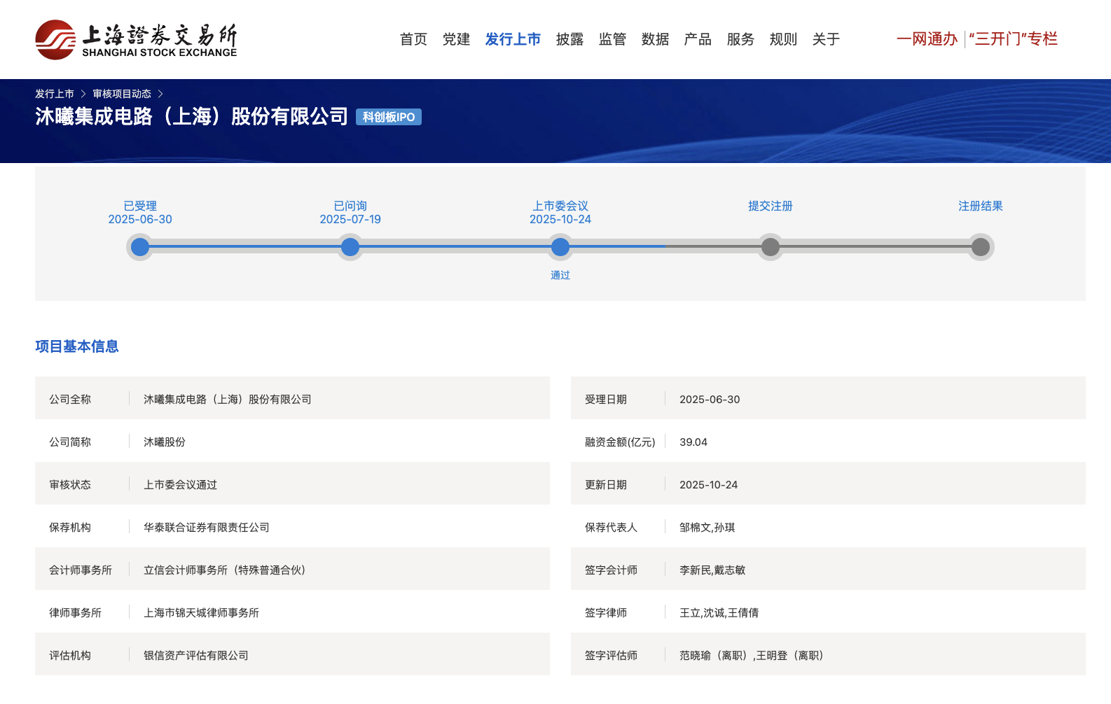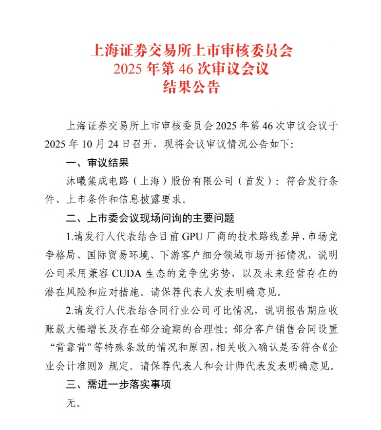 本报讯 (记者毛艺融)科创板“1+6”新政助力国产GPU开启发展竞速。10月24日,上海证券交易所上市审核委员会审议通过沐曦集成电路(上海)股份有限公司(下称“沐曦股份”)科创板IPO申请。上交所官网显示,沐曦股份上市申请6月30日获受理,7月19日问询通过,10月24日上市委会议通过。