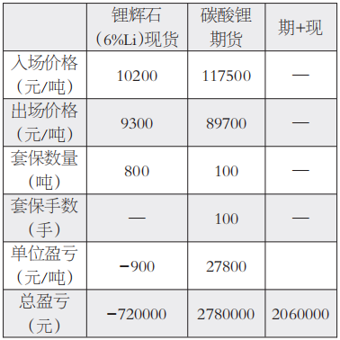 从项目操作过程来看,入场时,卖出期货合约均价为117500元/吨,现货买价为10200元/吨;出场时,期货合约平仓均价为89700元/吨,现货卖价为9300元/吨。期货盈利总计278万元,现货亏损总计72万元,期现组合盈利总计206万元,有效地降低了锂辉石库存市场风险,达成企业风险管控与盈利增益的双重目标。