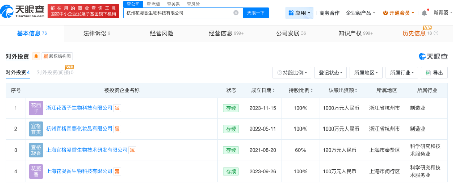 天眼查App显示,花西子关联公司杭州花凝香生物科技有限公司成立于2017年5月,法定代表人为张大勇,注册资本500万人民币,由浙江宜格美妆集团有限公司全资持股。对外投资信息显示,该公司持有4家企业股份。