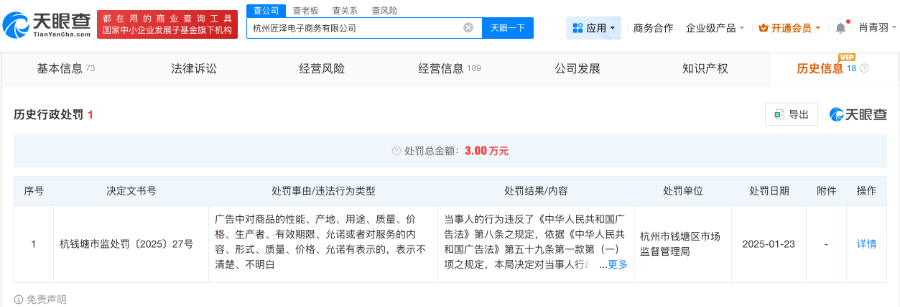 此外,今年1月,杭州匠泽电子商务有限公司曾因在其线上店铺发布的三款化妆品广告中对商品的性能、成分表述不准确,被杭州市钱塘区市场监督管理局罚款3万元。