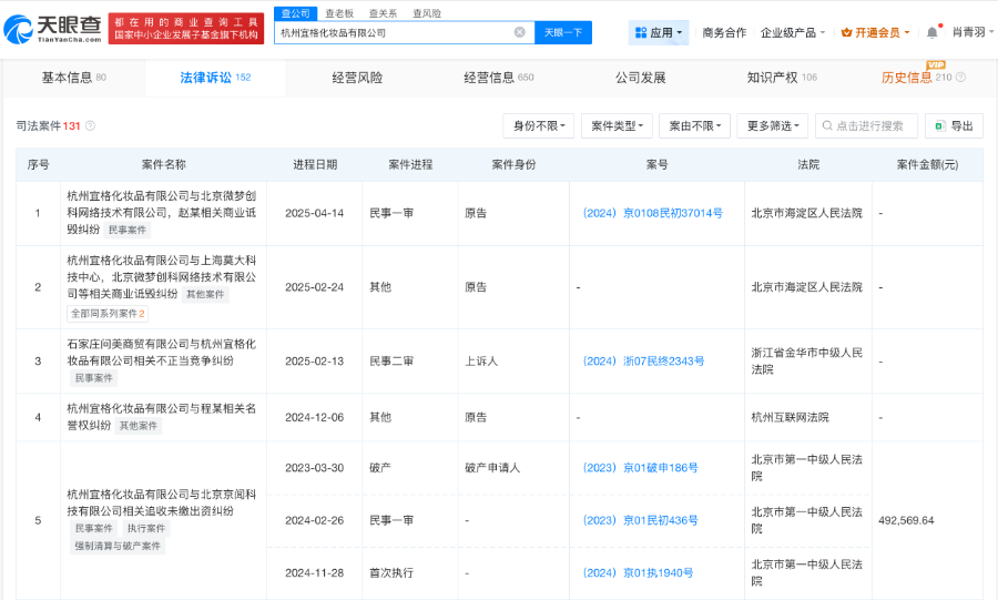 值得注意的是,天眼风险信息显示,杭州宜格化妆品有限公司涉及多个法律诉讼,案由包括侵害商标权纠纷、网络侵权责任纠纷、商业诋毁纠纷、名誉权纠纷等。