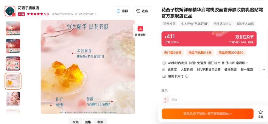10月23日,陷入争议的花西子桃娇鲜颜精华底霜已从品牌官方旗舰店下架。此前,第三方测评机构发布视频称,包含花西子在内的多个品牌化妆品被检出含有苏丹红成分。