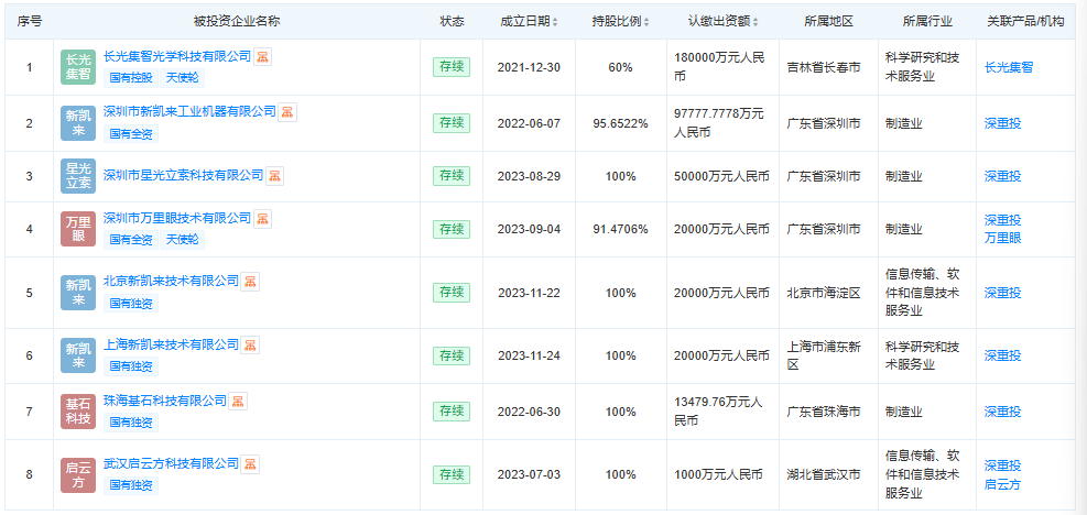 《科创板日报》记者注意到,截至目前,新凯来外对外投资的子公司共8家,分别是长光集智光学科技有限公司、深圳市新凯来工业机器有限公司、深圳市星光立索科技有限公司、深圳市万里眼技术有限公司、北京新凯来技术有限公司、上海新凯来技术有限公司、珠海基石科技有限公司、武汉启云方科技有限公司。