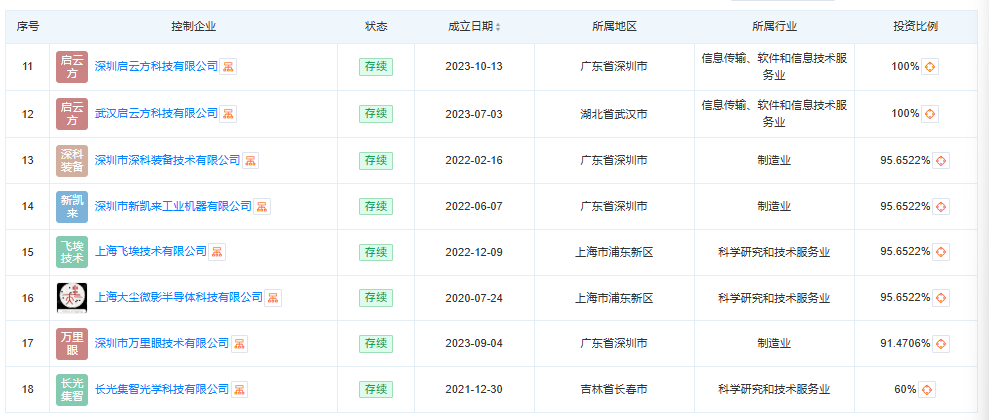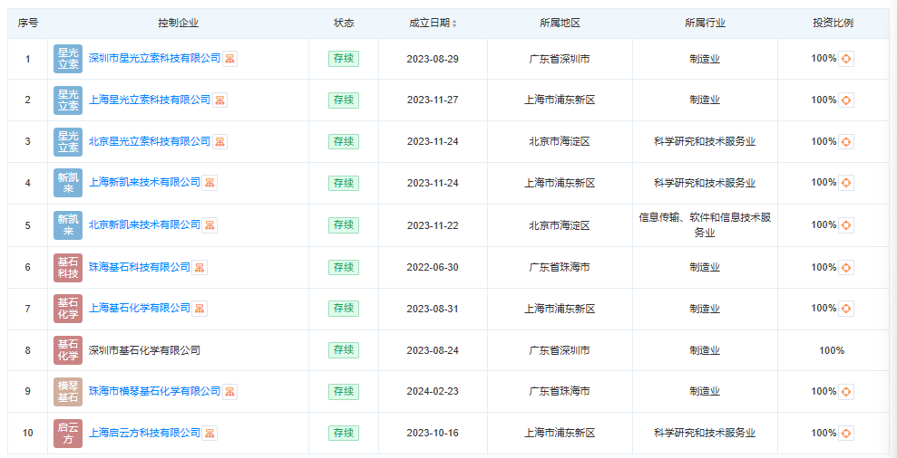 从控制企业来看,新凯来控制企业多达18家,其中,12家投资比例达100%,分别为深圳市星光立索科技有限公司、上海星光立索科技有限公司、北京星光立索科技有限公司、上海新凯来技术有限公司、北京新凯来技术有限公司、珠海基石科技有限公司、上海基石化学有限公司、深圳市基石化学有限公司、珠海市横琴基石化学有限公司、上海启云方科技有限公司、深圳启云方科技有限公司、武汉启云方科技有限公司。