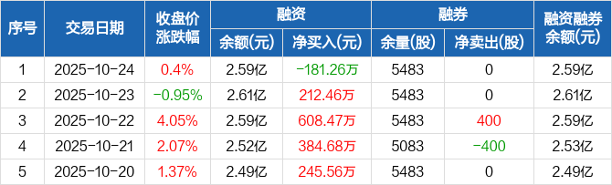 融资方面,当日融资买入788.84万元,融资偿还970.1万元,融资净偿还181.26万元。融券方面,融券卖出0股,融券偿还0股,融券余量5483股,融券余额13.73万元。融资融券余额合计2.59亿元。
