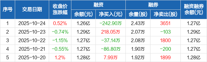 融资方面,当日融资买入296.67万元,融资偿还539.57万元,融资净偿还242.9万元。融券方面,融券卖出4851股,融券偿还1200股,融券余量2.43万股,融券余额52.2万元。融资融券余额合计1.27亿元。