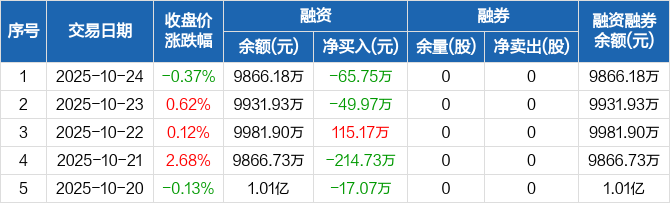 融资方面,当日融资买入311.95万元,融资偿还377.7万元,融资净偿还65.75万元。融券方面,融券卖出0股,融券偿还0股,融券余量0股,融券余额0元。融资融券余额合计9866.18万元。