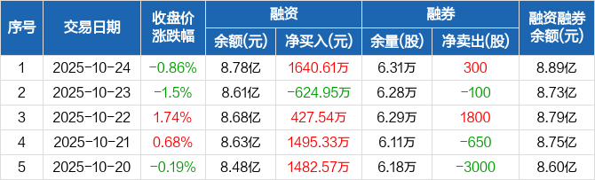 融资方面,当日融资买入5638.03万元,融资偿还3997.42万元,融资净买入1640.61万元。融券方面,融券卖出1000股,融券偿还700股,融券余量6.31万股,融券余额1156.85万元。融资融券余额合计8.89亿元。