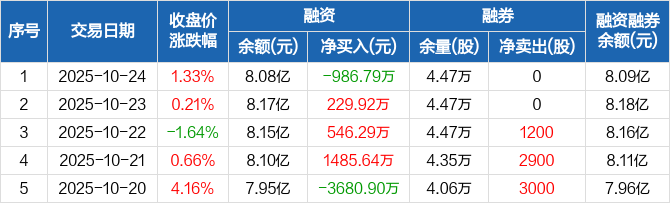 融资方面,当日融资买入3105.93万元,融资偿还4092.72万元,融资净偿还986.79万元。融券方面,融券卖出0股,融券偿还0股,融券余量4.47万股,融券余额109.12万元。融资融券余额合计8.09亿元。