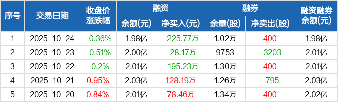 融资方面,当日融资买入189.8万元,融资偿还415.57万元,融资净偿还225.77万元,连续3日净偿还累计449.17万元。融券方面,融券卖出400股,融券偿还0股,融券余量1.02万股,融券余额25.5万元。融资融券余额合计1.98亿元。