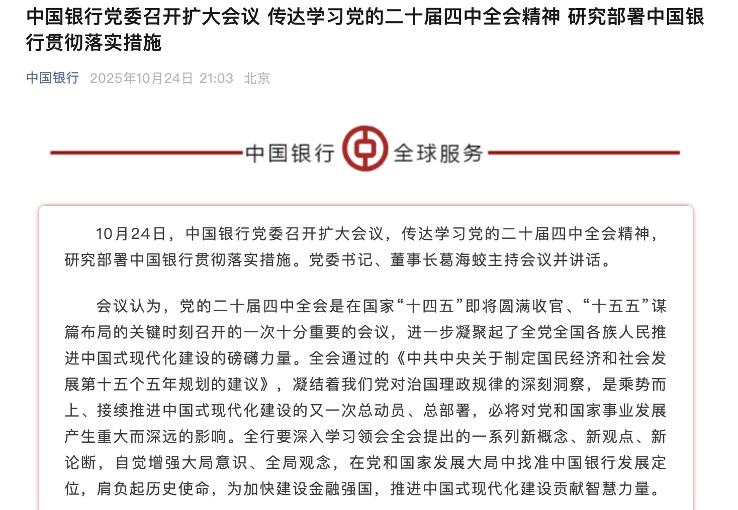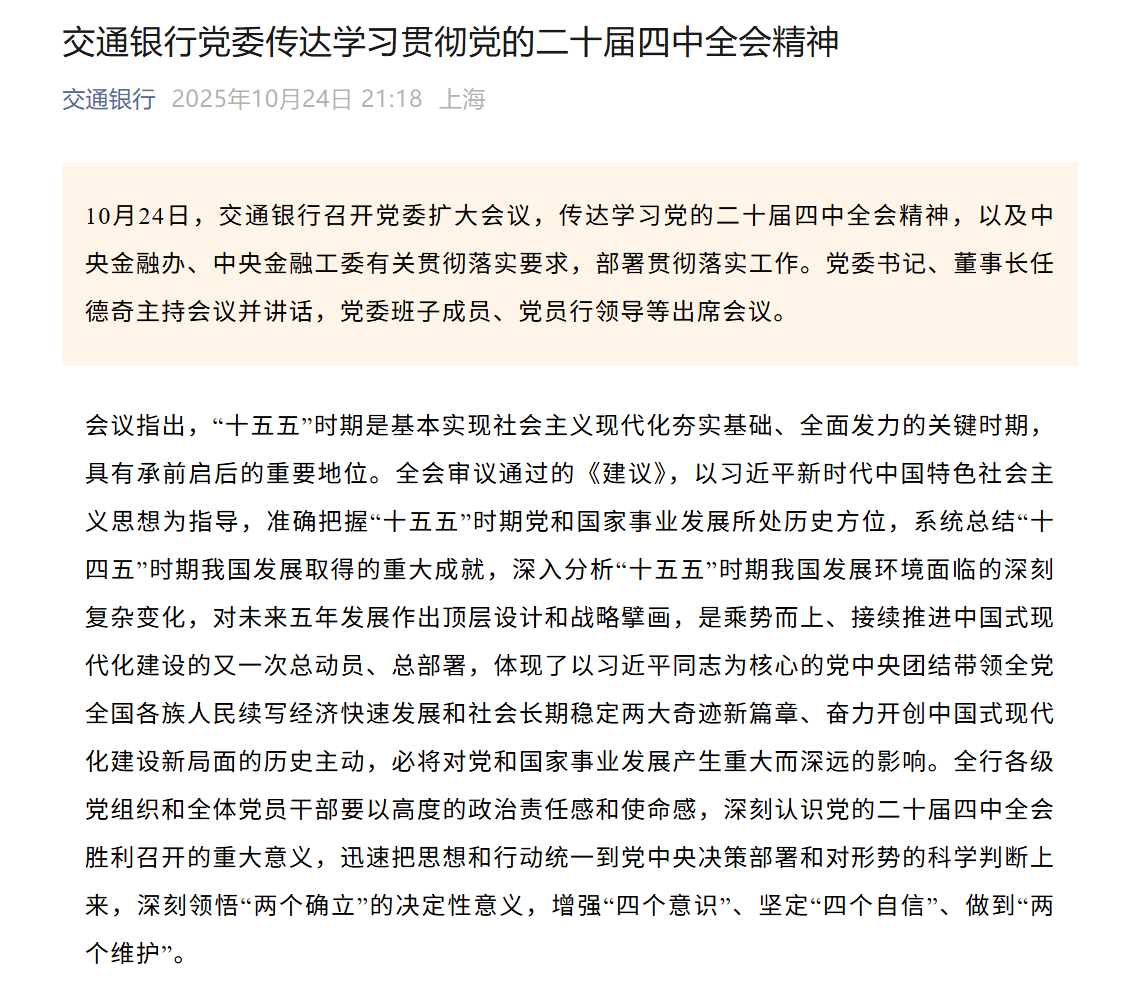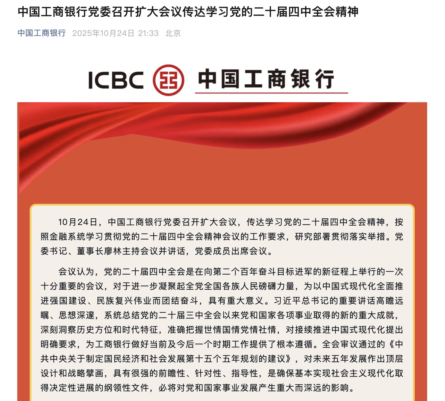 10月24日,工商银行、农业银行、中国银行、建设银行、交通银行、邮储银行党委纷纷召开会议传达学习党的二十届四中全会精神,按照金融系统学习贯彻党的二十届四中全会精神会议的工作要求,研究部署贯彻落实举措。