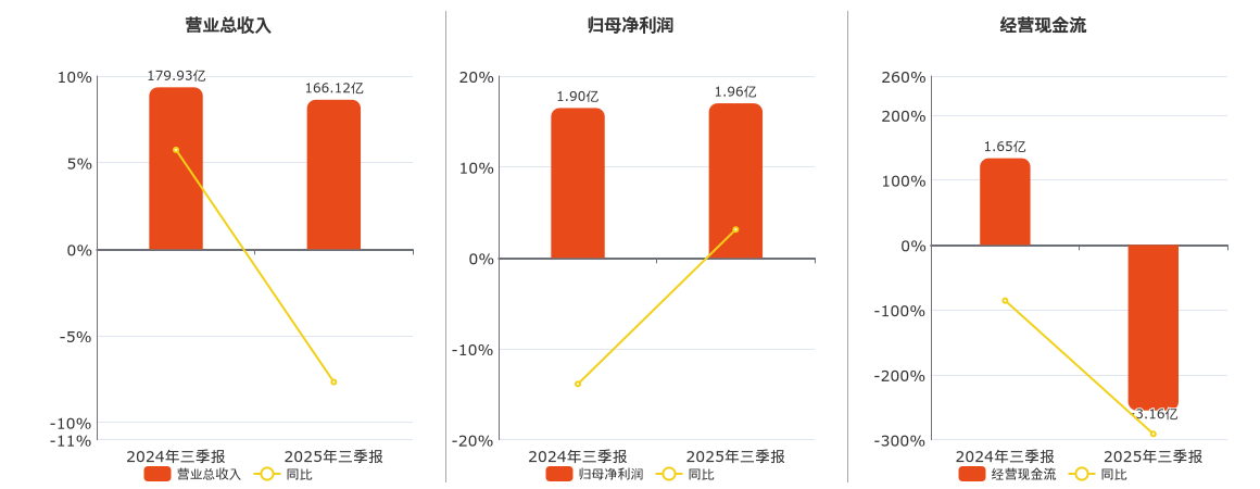 公司营业总收入为166.12亿元。归母净利润为1.96亿元,较去年同报告期归母净利润增加591.68万元,同比较去年同期上涨3.12%。经营活动现金净流入为-3.16亿元。