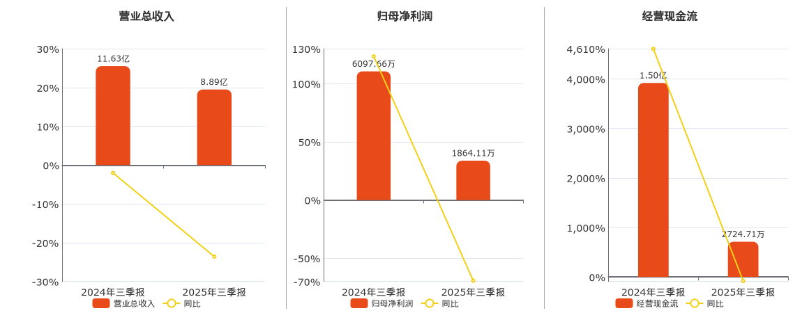 公司营业总收入为8.89亿元,较去年同报告期营业总收入减少2.75亿元,同比较去年同期下降23.61%。归母净利润为1864.11万元,较去年同报告期归母净利润减少4233.55万元,同比较去年同期下降69.43%。经营活动现金净流入为2724.71万元,较去年同报告期经营活动现金净流入减少1.23亿元,同比较去年同期下降81.82%。