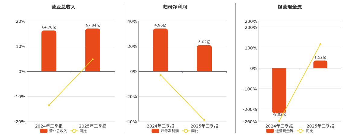 公司营业总收入为67.84亿元,较去年同报告期营业总收入增加3.06亿元,同比较去年同期上涨4.72%。归母净利润为3.02亿元,较去年同报告期归母净利润减少1.94亿元,同比较去年同期下降39.06%。经营活动现金净流入为1.52亿元,较去年同报告期经营活动现金净流入增加10.54亿元。