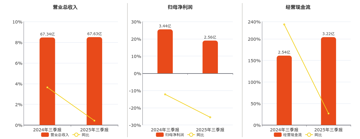 公司营业总收入为67.63亿元,较去年同报告期营业总收入增加2845.47万元,实现5年连续上涨,同比较去年同期上涨0.42%。归母净利润为2.56亿元,较去年同报告期归母净利润减少8785.92万元,同比较去年同期下降25.53%。经营活动现金净流入为3.22亿元,较去年同报告期经营活动现金净流入增加6775.82万元,实现2年连续上涨,同比较去年同期上涨26.65%。