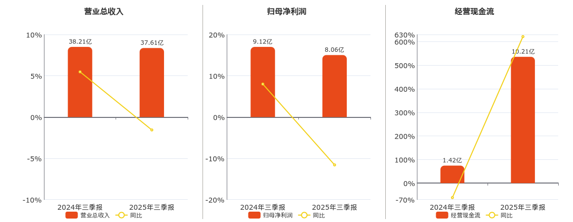 公司营业总收入为37.61亿元,较去年同报告期营业总收入减少5961.90万元,同比较去年同期下降1.56%。归母净利润为8.06亿元,较去年同报告期归母净利润减少1.06亿元,同比较去年同期下降11.59%。经营活动现金净流入为10.21亿元,较去年同报告期经营活动现金净流入增加8.79亿元,同比较去年同期上涨621.17%。
