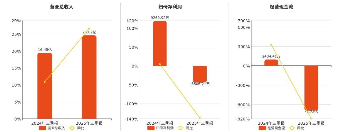 公司营业总收入为20.82亿元,较去年同报告期营业总收入增加4.38亿元,实现5年连续上涨,同比较去年同期上涨26.63%。归母净利润为-3506.21万元,较去年同报告期归母净利润减少1.28亿元,同比较去年同期下降137.82%。经营活动现金净流入为-1.73亿元,较去年同报告期经营活动现金净流入减少1.97亿元,同比较去年同期下降819.02%。