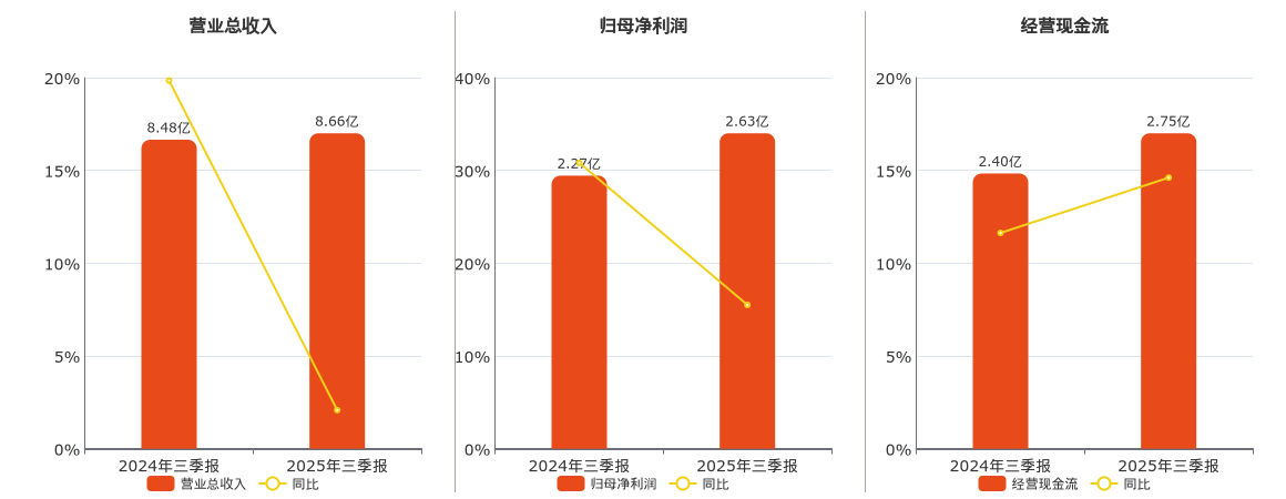 公司营业总收入为8.66亿元。归母净利润为2.63亿元。经营活动现金净流入为2.75亿元。