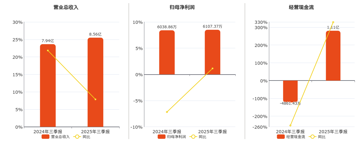 公司营业总收入为8.56亿元。归母净利润为6107.37万元。经营活动现金净流入为1.11亿元。