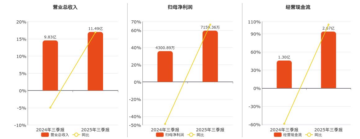 公司营业总收入为11.49亿元。归母净利润为7159.36万元。经营活动现金净流入为2.67亿元。