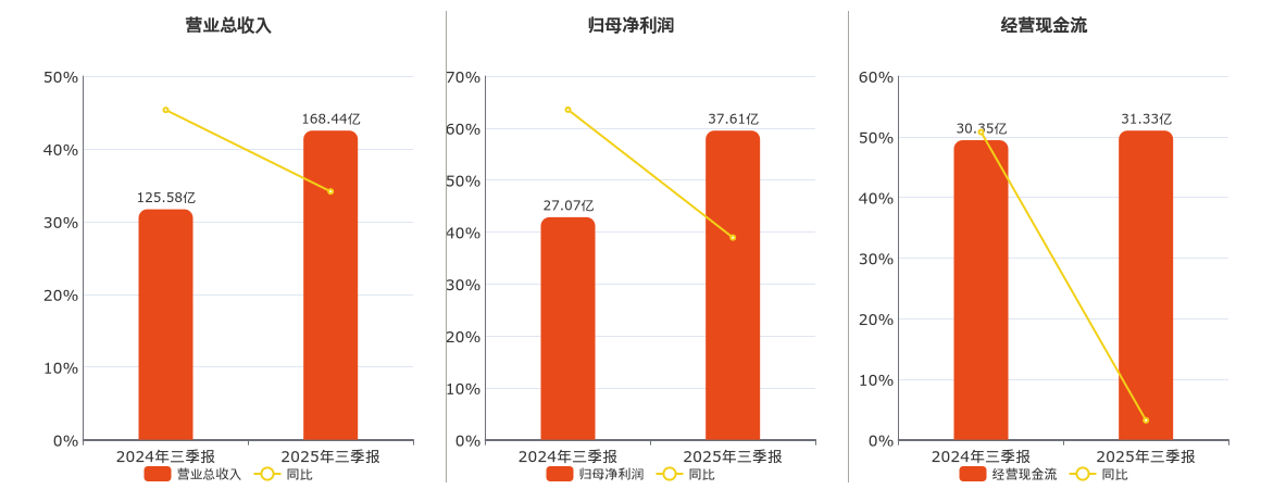 公司营业总收入为168.44亿元。归母净利润为37.61亿元。经营活动现金净流入为31.33亿元。