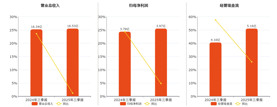 公司营业总收入为16.53亿元。归母净利润为3.97亿元。经营活动现金净流入为5.16亿元。