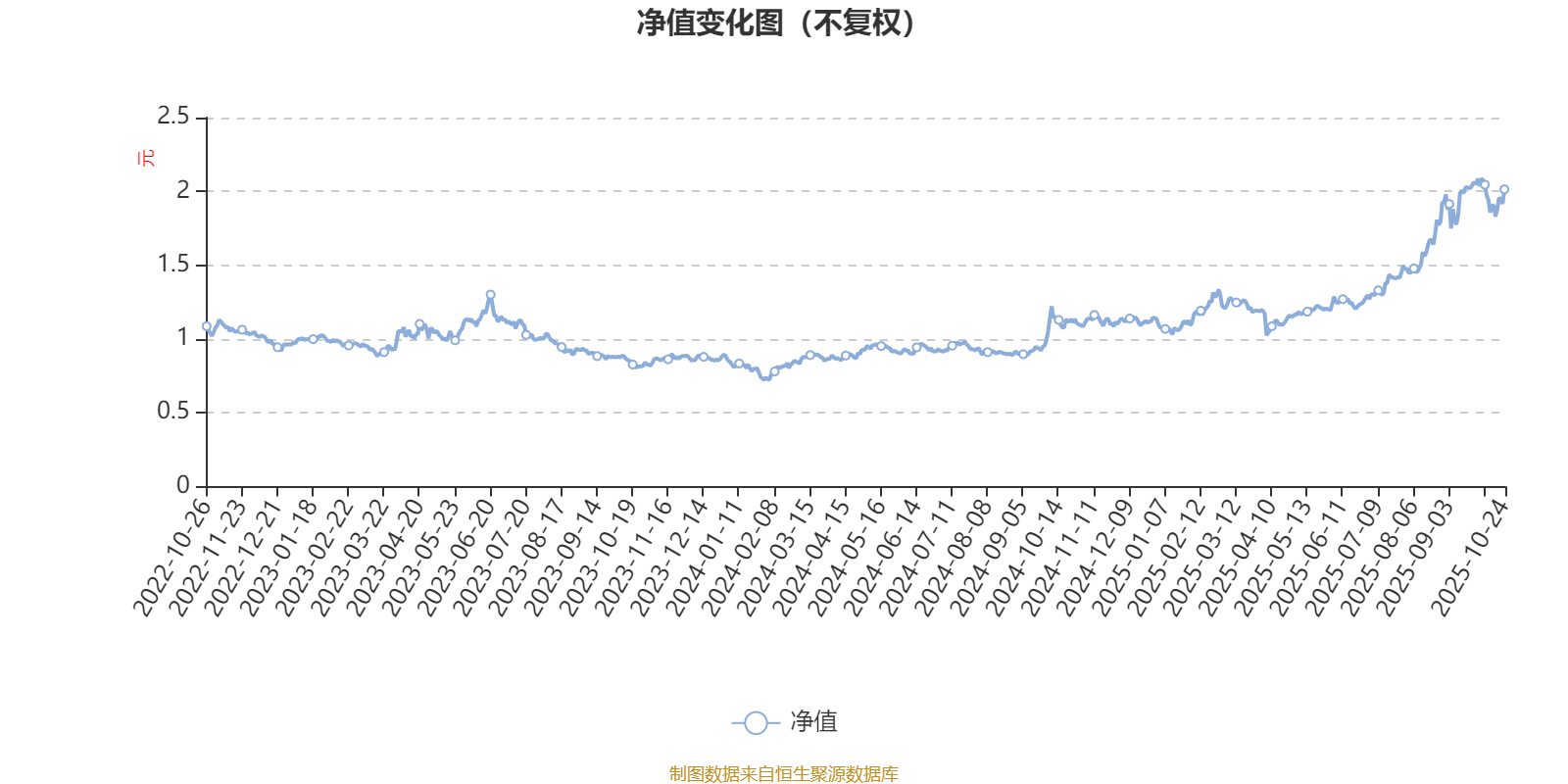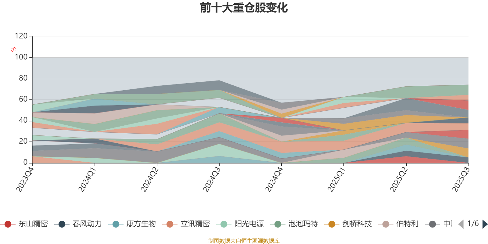 该基金持股集中度较高。截至2025年三季度末,基金十大重仓股分别是新易盛、中际旭创、工业富联、剑桥科技、海博思创、胜宏科技、腾讯控股、中创新航、东鹏饮料、春风动力。