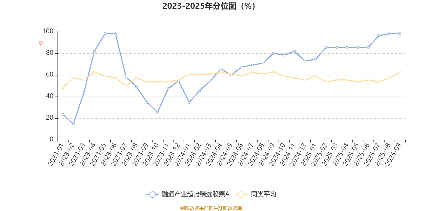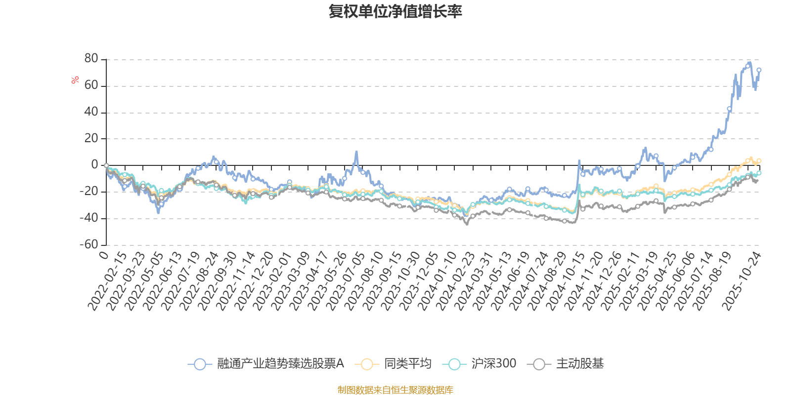 截至10月24日,融通产业趋势臻选股票A近三个月复权单位净值增长率为41.81%,位于同类可比基金2/58;近半年复权单位净值增长率为73.84%,位于同类可比基金1/57;近一年复权单位净值增长率为81.03%,位于同类可比基金1/57;近三年复权单位净值增长率为89.32%,位于同类可比基金3/56。
