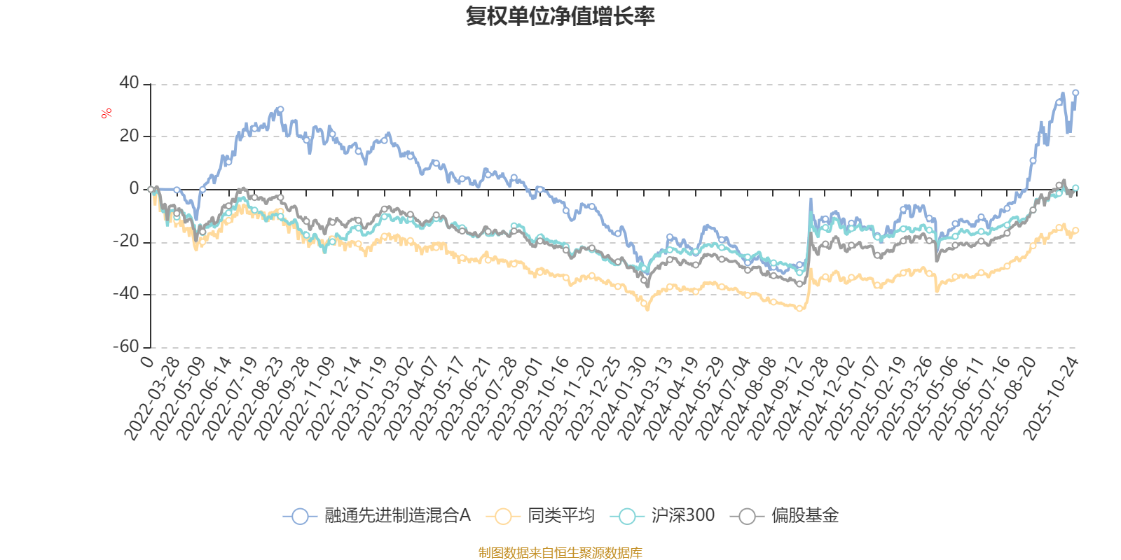 截至10月24日,融通先进制造混合A近三个月复权单位净值增长率为43.21%,位于同类可比基金26/621;近半年复权单位净值增长率为61.71%,位于同类可比基金37/618;近一年复权单位净值增长率为56.47%,位于同类可比基金67/611;近三年复权单位净值增长率为11.21%,位于同类可比基金284/518。