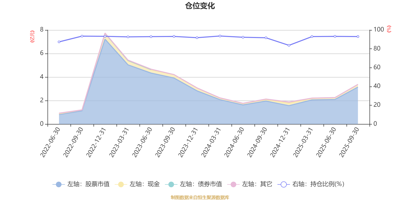 据定期报告数据统计,近三年平均股票仓位为92.06%,同类平均为85.44%。2024年一季度末基金达到93.63%的最高仓位,2024年末最低,为83.71%。