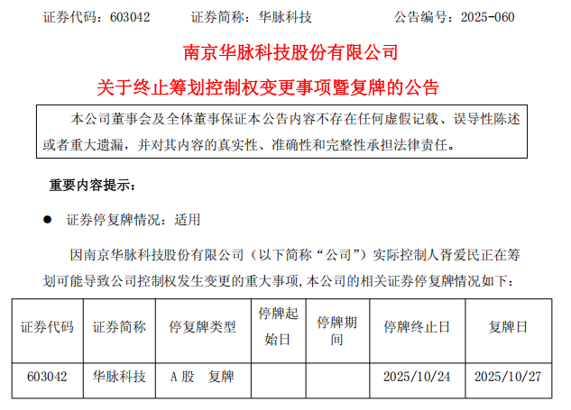 10月24日晚间,华脉科技发布公告称,交易双方决定终止筹划公司控制权变更事项。