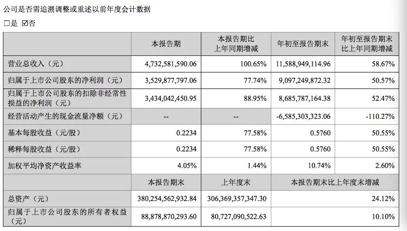 资产规模方面,截至2025年9月30日,公司总资产达3802.55亿元,较上年度末增长24.12%;归属于上市公司股东的所有者权益888.79亿元,较上年度末增长10.10%。值得注意的是,交易性金融资产余额990.85亿元,较年初增长34.72%,主要因债券投资规模增加。