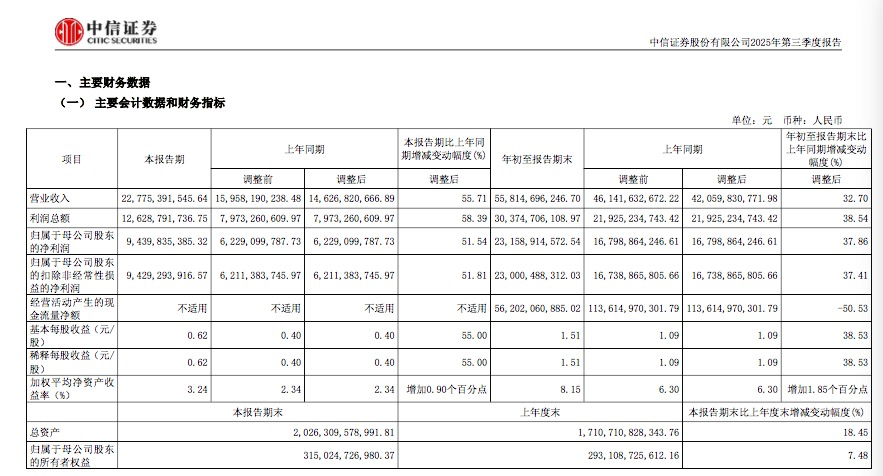 10月24日,中信证券发布2025年第三季度报告。数据显示,公司单季与前三季度业绩均保持高增态势,资产规模突破2万亿元。
