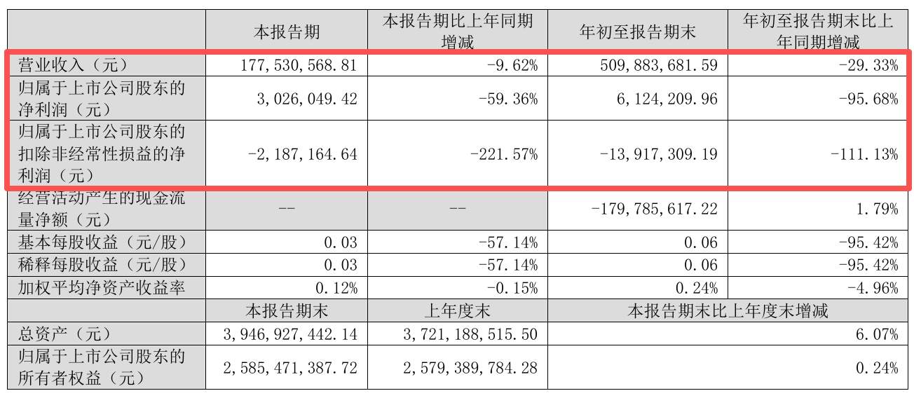 其中,第三季度,公司营业收入为1.78亿元,同比下降9.62%;归母净利润为302.60万元,同比下降59.26%;扣非归母净利润亏损218.72万元,同比下降221.57%。