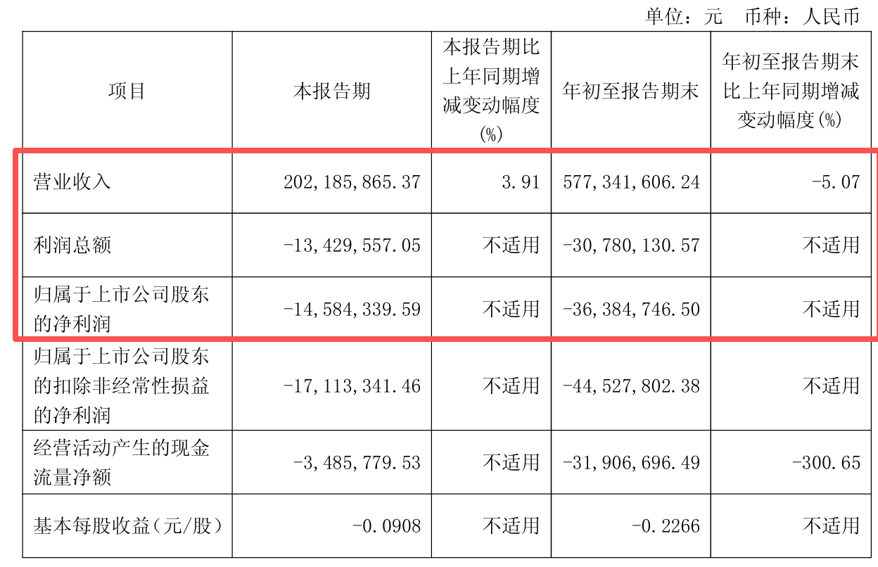 其中,第三季度,公司营业收入为2.02亿元,同比上升3.91%;归母净利润自去年同期亏损412万元变为亏损1458万元,亏损扩大;扣非归母净利润自去年同期亏损652万元变为亏损1711万元,亏损扩大。