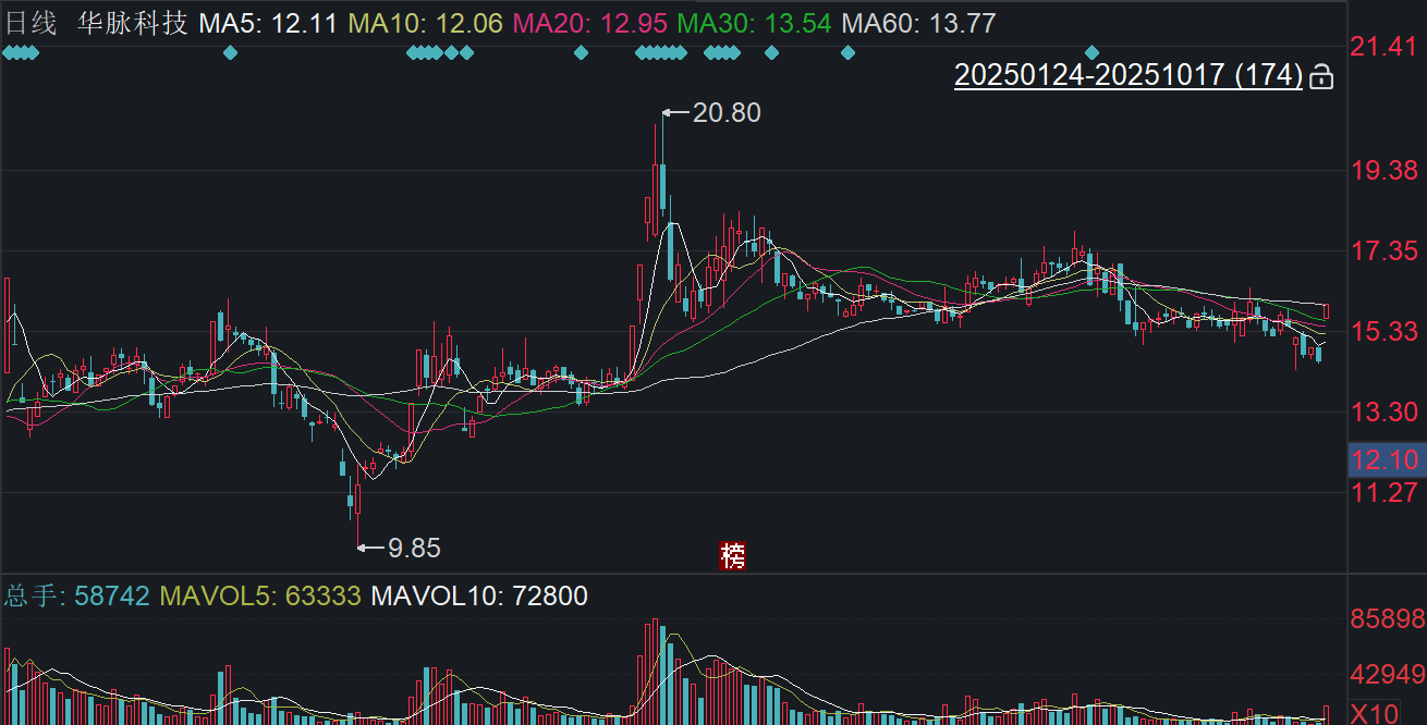 10月17日,华脉科技开盘价为15.60元/股,较前一交易日上涨7.36%,随后股价迅速攀升,一举封死涨停板。最终,该股以涨停价15.98元/股收盘。